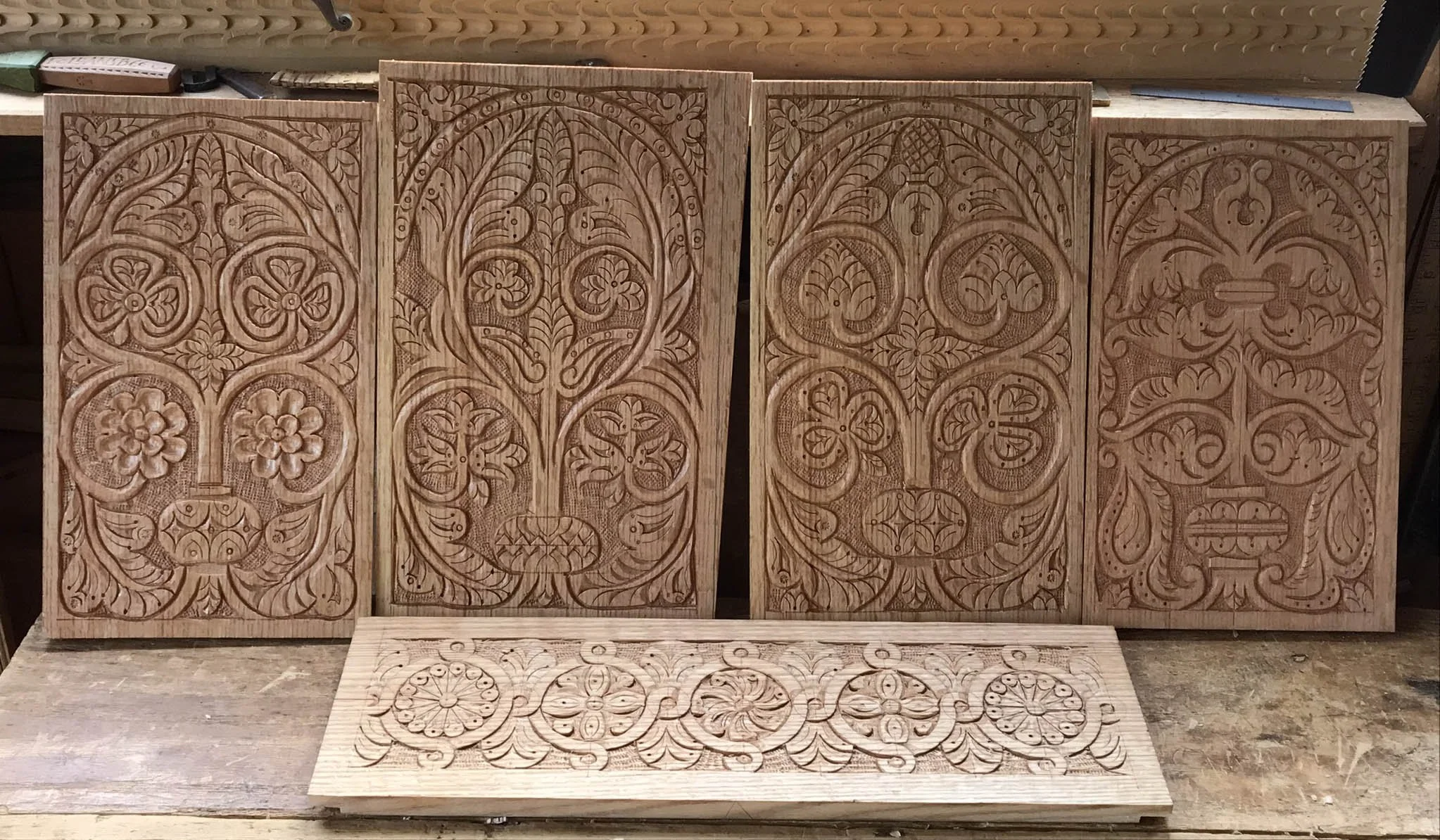 Decorative carving techniques using knife and gouge.